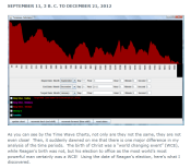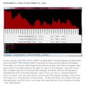 Looking once again at the TimeWave charts for signs of confirmation that the above information could be correct, that is, that the time wave from 2/6/1911 to 2/6/2012 might indicate a repeated pattern of “fractal time” as occurred from the previously stated birth of Christ on 9/11 in 3 B. C. to 2/6/2012, here are the results displayed in the following charts of those periods of time. Amazingly, they are exactly the same even though there is over 1911 years difference in the span of time between to the two time periods! In simple language, the Fractal Time shown in these charts indicate that from the birth of the Messiah, Jesus Christ, to 2/6/2012, and from Reagan’s first election as U. S. President on November 4, 1980 (possible Anti-Messiah – DNA clone) to 2/6/2012, appears to indicate in Fractal Time that the birth of a “Messiah” is repeating once again in history. Only this “Messiah” will not be the coming Messiah of the Bible, but what Christians would proclaim as the Anti-Messiah or the Antichrist!