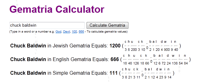 CHUCK BALDWIN = 666 (Noted American patriot and minister who also appears to oppose the “works of darkness”. This is the name that he goes by in his ministry and elsewhere in the media.)
