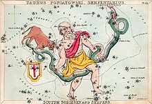 “Ophiuchus is a large constellation located around the celestial equator. Its name is from the Greek Ὀφιοῦχος “serpent-bearer”, and it is commonly represented as a man grasping the snake that is represented by the constellation Serpens. Ophiuchus was one of the 48 constellations listed by the 2nd-century astronomer Ptolemy, and it remains one of the 88 modern constellations. It was formerly referred to as Serpentarius (English pronunciation: /ˌsɜrpənˈtɛəriəs/; also Anguitenens), a Latin word meaning the same as its current name.”