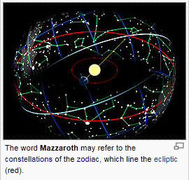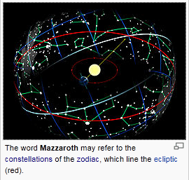 “Mazzaroth is a Greek form (μαζουρωθ) of the Hebrew plural word Mazarot (מַזָּרֹות), which occurs once in the Hebrew Bible, in Job 38:31-32, with a very similar word also occurring in 2 Kings 23:3-5. The meaning of the word has been described as “unsettled”[1] and “uncertain,”[2] although some scholars, such as Franz Delitzsch,[3] believe the word refers to the zodiac, the pattern of stars found on the ecliptic.”