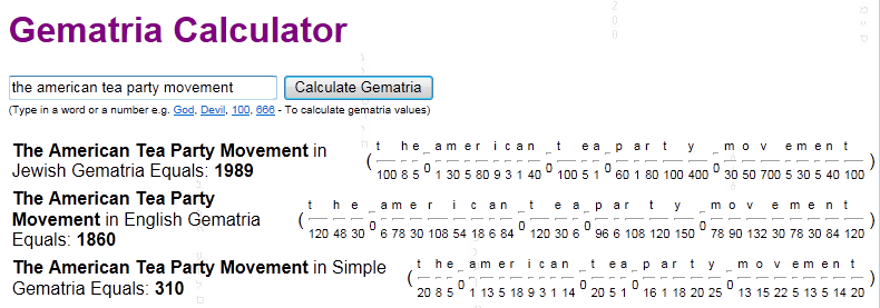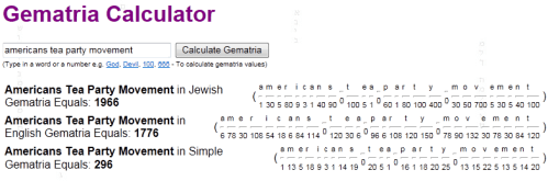 While there are other countries involved in a Tea Party Movement of some sort, I find it spiritually relevant that the numerical value of Americans Tea Party Movement has the numerical value of 1776, a number made up of the numbers 1110 and 666! Refer to the Part I of The Lucifer Project – Raising Antichrist for a full explanation of 1776.