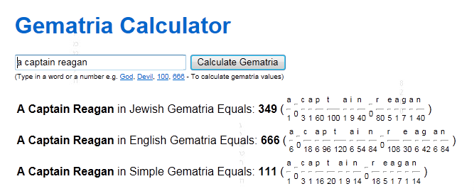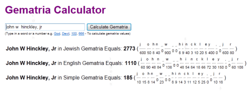 What about the number of 1110 associated with the NEW WORLD ORDER? Can it be found in the assassination attempt in some way? Yes it can! Referring back to the very first article in this series, you’ll recall that 666 + 444 = 1110, and all three numbers are associated with the life of Ronald Wilson Reagan! Who was the man who attempted to assassinate Reagan? The “stamp” of the NWO under Antichrist appears once again. You might also notice that the number, 111, appears in many “Simple Gematria” calculations that reveal the number 666! This is 1110 without the zero being present. Satan himself will complete the total picture of the NWO as the created “eternal being”, as zero implied eternity to the Luciferians.