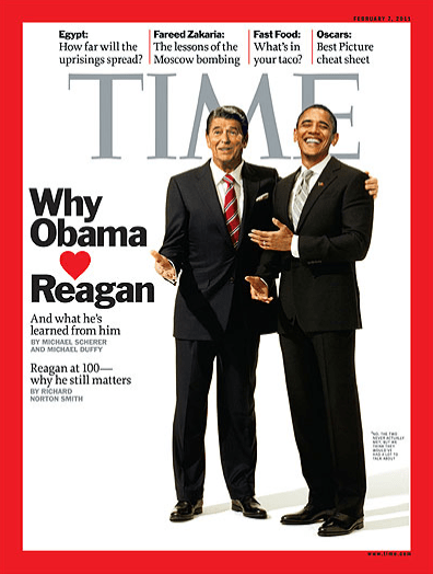 As we have already seen in a previous article, Time Magazine’s February 7th, 2011, issue has Obama and Reagan on the front cover. Even B. O. is attempting to capture the “Reagan Mantle” with talk of “loving the Gipper“, and his declaration for the Ronald Reagan Centennial Commission.
